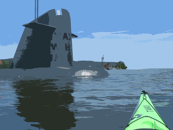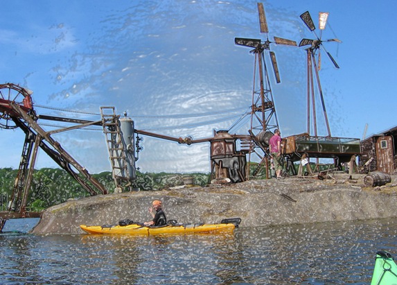 Wir befinden uns nicht am Klondike beim Goldwaschen, nicht in der Arktis oder vor einem U-Bootstützpunkt sondern auf dem Baldeneysee in Essen. Nahezu surreal wirken diese Gebilde aus der Sicht des grünen Seekajaks.