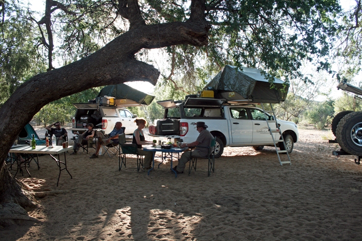 „Wir haben unser Camp unter den weit ausladenden Ästen eines Mompanebaumes aufgeschlagen und befinden uns an den Ufern des Kunene. Der Fluss bildet die natürliche Grenze zwischen Namibia und Angola. Die am gegenüberliegenden Ufer sich steil emporhebenden Gebirgszüge gehören bereits zum Territorium von Angola.
