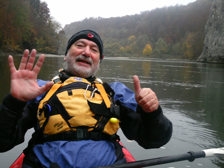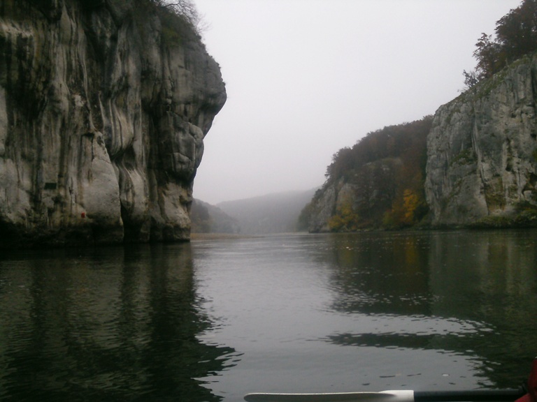 Mystisch, einsam und ein wenig schaurig erleben wir den Donaudurchbruch am Halloweenmorgen im November. Es ist neblig, kalt bei 6° C. Wir entscheiden uns trotzdem mit klammen Fingern unseren roten russischen Expeditionszweier ( in Lettland auf den Namen "ROTEN OKTOBER" getauft ) aufzubauen. Die Faltboothaut ist bei der Kälte besonders widerspenstig und das Alugestänge klebt vor Kälte an der Haut fest. Warm angezogen mit einer Thermoskanne heißen Tee schwenken wir in Einig in die Strömung der Donau ein. Am Weltenburger Kloster vorbei, paddeln wir in die "Weltenburger Enge" und werden mit einem phantastischen Naturpanorama belohnt. Keine Touristen, kein Ausflugsschiff, nur unser Kajak befindet sich in dieser Naturkulisse. Mein Ruf " Ist denn hier niemand ?" wird nicht beantwortet. Ein Landschaftssechser bei 6 ° C im November.