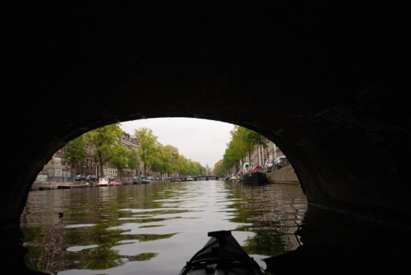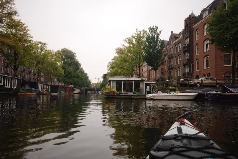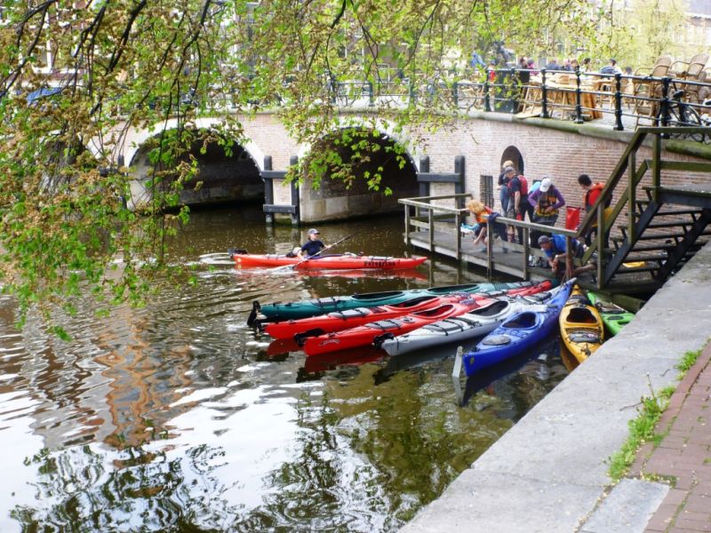 Wir setzen ein am Sloterplassee und starten unsere Stadtrundfahrt durch die Grachten von Amsterdam in nördlicher Richtung. An der Seeschleuse tragen wir unseren Touringzweier um und haben von nun an freie Fahrt in das Amsterdamer Grachtenlabyrinth. Schon bald paddeln wir durch Hausbootgrachten dem Stadtzentrum entgegen. Nun können wir die Hausboote genauer betrachten. Diese Vielfalt an Wohnkultur beeindruckt uns. Da liegt ein Designerboot, dessen Designerküche wir wegen der fehlenden Gardinen bestaunen können. An der Uferspuntwand liegen auch Boote, an denen Zeit und Wetter nicht spurlos vorüber gegangen sind. Auf der Grachtterrasse eines Hausbootes sitzt ein Hausbootbewohner mit Jamaikakappe. Pfeifend und grinsend hört er Reggaemusik aus dem Handy, die über Bluetooth auf die Lautsprecher übertragen wird. Unsere Blicke begegnen sich und nach einem herzlichen Gruß schaukelt unser Kajak mit der abklingenden Lautstärke im Takt der Reggaemusik der Einfahrt in die touristische Amstelgracht entgegen.