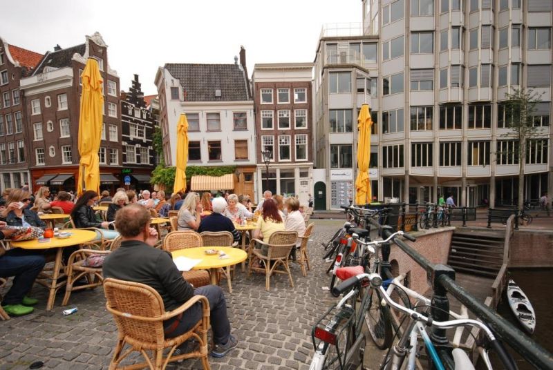 Im Zentrum gehören wir zu den am häufigsten fotografierten Sehenswürdigkeiten. Die Gracht mit der Zugbrücke im Hintergrund und dem bunten Kajak im Vordergrund scheint ein beliebtes Fotomotiv zu sein. Der Bootsverkehr nimmt nun ständig zu. Neben den Ausflugsbooten sind immer mehr Partyboote in den Grachten unterwegs. Diese scheinen für Betriebsausflüge, Junggesellenabschiede und Geburtstage immer beliebter zu werden. In der Regel ist der Promillepegel sehr hoch und wir hoffen, dass der Bootsführer noch Herr seiner Sinne ist. Manchmal bleibt nicht mehr viel Platz zwischen unserem Kajak, der Kanalwand und der touristischen Personenschifffahrt. Striktes Rechtsfahrgebot gilt genauso wie vorsichtiges Einfädeln an Kreuzungen. Schließlich erreichen wir die Singlegracht 161 . Unter der Grachtenbogenbrücke des Cafes Villa Zeesicht können wir mit unserem Kajak anlegen. Wir sitzen auf der Brücke und genießen den wohl leckersten klassischen Apple Pie Amsterdams, bevor wir uns auf die Rückfahrt zum Sloterplas aufmachen. Ein Blick in den Keller des Cafes lässt zahlreiche gestapelte Apfelkisten erkennen. Der Kellner erklärt uns, dass der Apfelkuchen den ganzen Tag über frisch gebacken wird. Kein Wunder also, dass der Geschmack dieses Apfelkuchens seines Gleichen sucht. Diese Ausstiegsstelle ist nahezu einzigartig in Amsterdam. Wir entdeckten sie auf einer Fahrradtour und speicherten die Koordinaten im Navi.