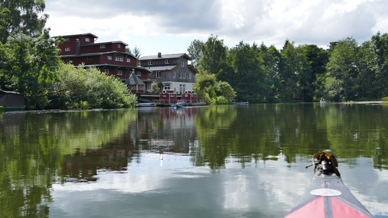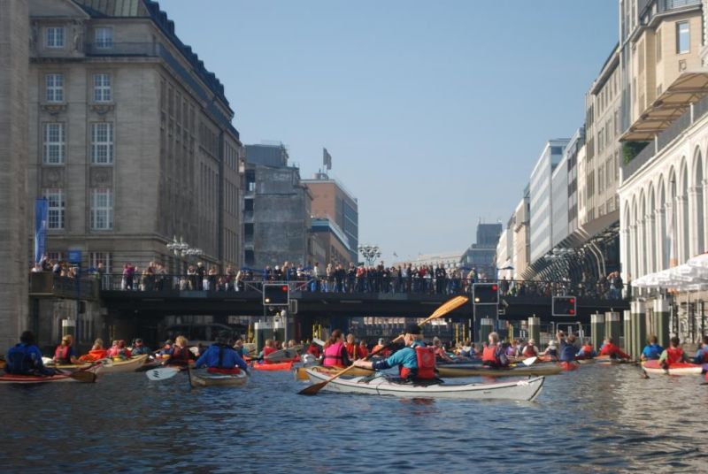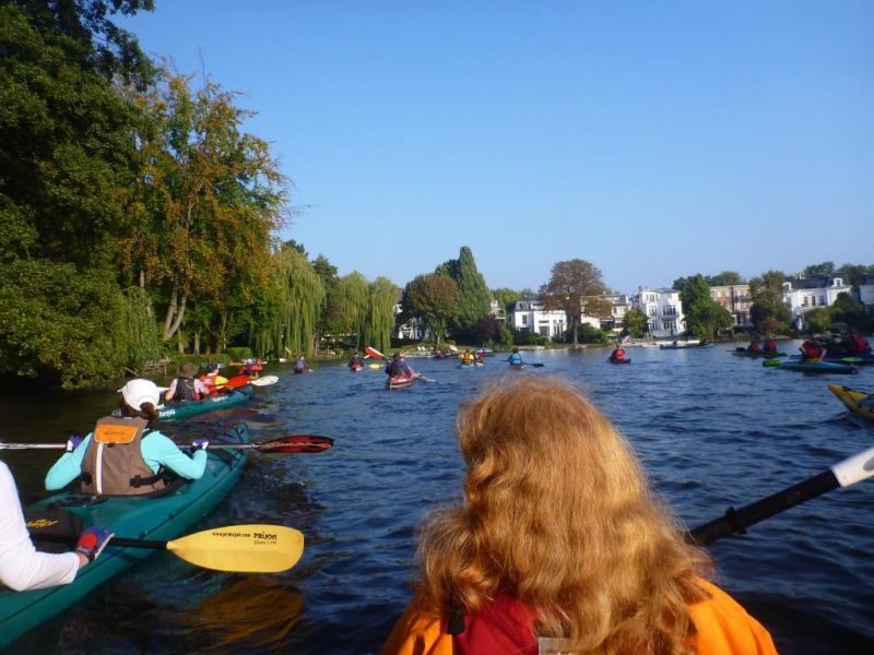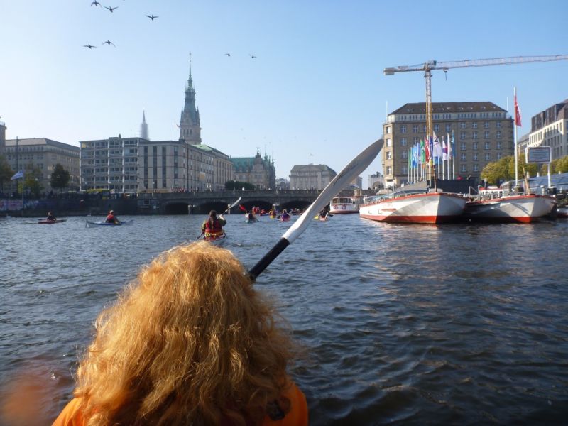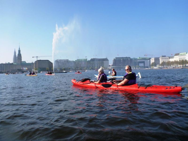 Nach der Einsatzstelle im Osterbekkanal wollen wir das quirlige Leben der Innenstadt von Hamburg im Kajak erleben. Wir paddeln zunächst an hübsch angelegten Gärten mit gehissten St. Pauli Piratenflaggen vorbei, lassen einen Pottwal aus Metall steuerbord liegen und bestaunen die vom Wasser aus zu sehenden Villen mit ihren zu den Gärten ausgerichteten herrschaftlichen Eingangsportalen. Nachdem wir in einen kleinen Stichkanal rechts abbiegen, erreichen wir den kreisrunden Rondeelteich und schließlich die Außenalster, überqueren den Binnensee, das Herz des Hamburger Wassersports unter einer riesigen Wasserfontäne und nach der Unterfahrung zweier Brücken die Binnenalster.