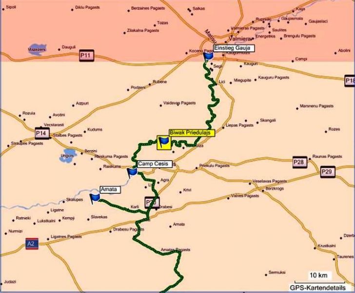 Das Pendeln des Bootes und der Personen gestaltet sich sehr einfach. Wir sprechen die Leihbootvermittlung im Kanucamp an, ob Sie uns und das Faltboot zur Einsatzstelle nach Valmiera mitnehmen würden. Wieder sind wir überrascht über die Freundlichkeit, mit der unsere Frage beantwortet wird und so bleibt unser Fahrzeug am nächsten Tag sicher auf dem Zeltplatz stehen, während wir mit unserem Boot und unserem Zeltgepäck zur Einsatzstelle chauffiert werden. Wir werden sogar gebeten, uns von unseren Biwakplätzen mit dem Handy zu melden, damit man sich keine Sorgen machen müsse.