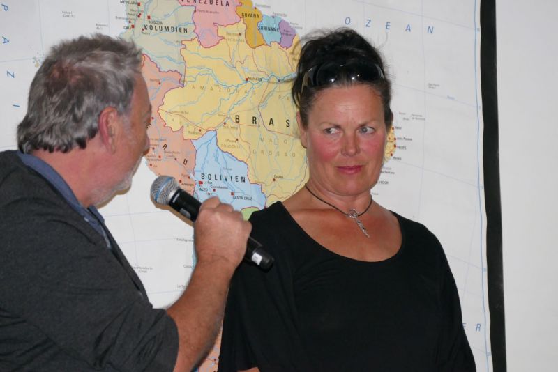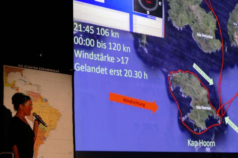 Als Freya Hoffmeister von der Notlandung auf Kap Horn berichtete, konnte man in der Aula des Reichenbach Gymnasiums eine Stecknadel fallen hören. Man muss sich einen kleinen Kajak im riesigen, aufgewühlten Meer vorstellen, der sich der tobenden Gewalt der Wellen widersetzte. Obwohl die Wettervorhersagen eine ruhige Querung vorausgesagt hatten, überraschte sie ein Orkan der Windstärke 17 mit bis zu 120 kn! Hoffmeister musste unter Lebensgefahr notlanden und die Fahrt für mehrere Tage unterbrechen. Der Abend endete mit vielen Fragen begeisterter Zuschauer.