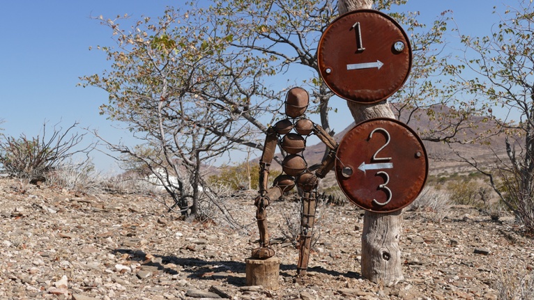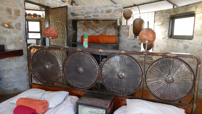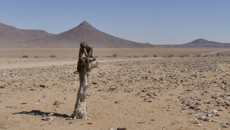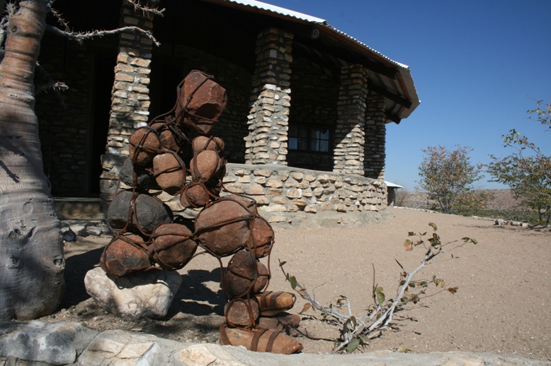 Von dem Orientierungspunkt, der „Red Drum“ sind es nun noch weniger als 30 km Piste bis zum „House on the Hill“ in Orupembe. Der heimische Architekt und Künstler Trevor Knott hat sich hier einen Traum verwirklicht. Eine nicht bewirtschaftete aber liebvoll eingerichtete Lodge mit angeschlossener Campside wartet hier hoch oben auf dem Berg mit traumhafter Aussicht auf den staunenden Kaokolandreisenden. Ein „Lone Man“ weist uns, wo wir von der Piste abweichen müssen.