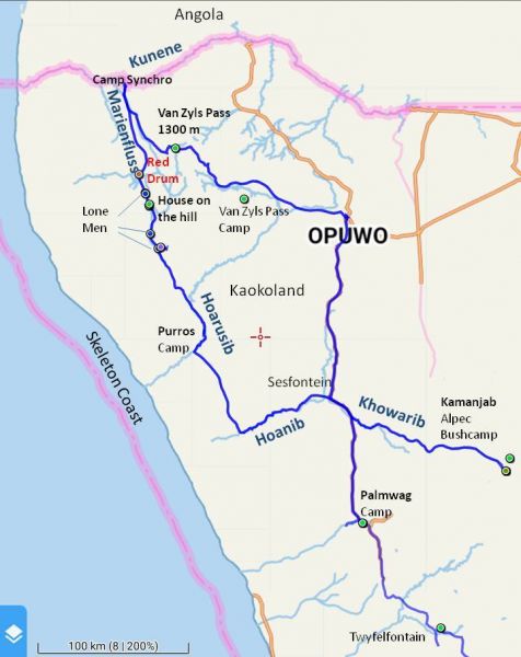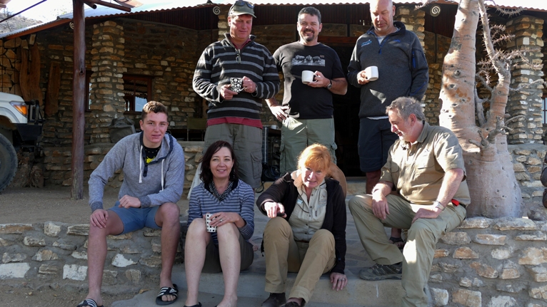 Über Funk können wir uns in den Fahrzeugen untereinander verständigen. Für den Notfall haben wir ein Satellitentelefon für diese Tour gemietet. Die Fahrzeuge sind mit GPS- Trackern ausgestattet. Über einen mitgeführten Satellitensendeempfänger SPOT können unsere Familien zuhause die aktuelle Position auf Google Maps verfolgen. Ab Opuwo werden wir keine gesicherte Einkaufs- und Tankmöglichkeit mehr haben, sodass wir mit den an Bord mitgenommenen Lebensmittel- und Dieselvorräten bei unserer geplanten Fahrt über den uns technisch herausfordernden van Zyls Pass ins Mariental bis an den Kunene und zurück nach Pamlwag auskommen müssen. Seit sechs Monaten planen wir diese Tour und freuen uns auf das gemeinsame Erlebnis und den Genuss dieser fantastischen Landschaft und seiner Tierwelt in der letzten Wildnis im Nordwesten Namibias. Mit seinen Ortskenntnissen wird uns Bennie die nächsten Tage führen. Das uns folgende Toyota- Land Cruiser- Kraftpaket gibt uns mit seiner an Bord befindlichen Seilwinde die psychische Sicherheit bei den geplanten Sandpassagen.