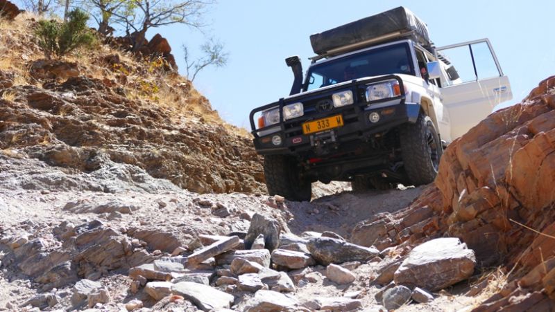 Um 1940 wurde der 1300 m hohe van Zyl’s Bergpass zur Kontrolle des Marienflusstals von Ben van Zyl, einem südafrikanischen Beamten für Eingeborenenfragen errichtet. Van Zyl sparte sich damit den langen Umweg über Orupembe. Seit dieser Zeit ist der Pass nicht mehr gepflegt. Witterung und Regen nagen ständig am Boden des engen steinigen Pfades. Der Pass wird als steilster Pass und als einer der unwegsamsten Pässe Afrikas bezeichnet. Aufgrund der Steilheit und der hohen Felsstufen darf der Pass nur in einer Richtung von Ost nach West befahren werden. Tatsächlich erwartet unser Team die hohe Schule des Offroadfahrens. Gleich nach der Einfahrt in den Pass liegt ein 50 m langer steiler und schmaler Anstieg vor uns, auf dessen lockerem Schotter sich gerade die Räder des vor mir fahrenden Pick Ups hochwühlen. Zu allem Überfluss muss am Ende der Bergstrecke noch eine 20 cm hohe Steinklippe überfahren werden. Danach verschwindet der Allradler in einem Blind Head auf der anderen Seite. Über Funk werden wir von Bennie aufgefordert nachzukommen. Steil und schief wird sich die Fahrbahn in den nächsten Stunden präsentieren und genauso brachal geht es hinter den steilen Klippen wieder abwärts.