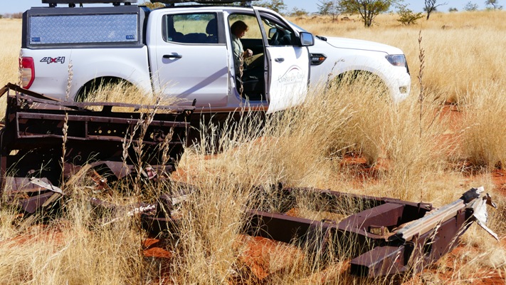 Ein altes ausgebranntes Landroverwrack weist uns noch einmal auf die möglichen Brandgefahren hin, die hier durch heiße Motor- oder Auspuffoberflächen beim Durchfahren dieses trockenen Grases vorliegen.