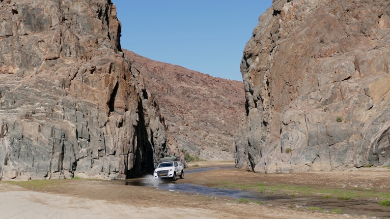 Wir sind auf der Suche nach den Wüstenelefanten. Eine Sandpassage wechselt mit der nächsten. Das Driften im Sand der Trockenflüsse wird immer mehr zur Routine. Vom Tal des Khumibrivers wechseln wir kurz vor Purros über ein Plateau in das Hourasibtal. Ab und zu müssen wir das Ufer wechseln und furten. In der durch Felsenwände eingerahmten engen Purrosschlucht ist der Wasserstand zum Glück nicht zu hoch. Die Pick Ups finden noch genügend Grip. Nur Elefantendung weist bisher auf die Anwesenheit von Elefanten hin.