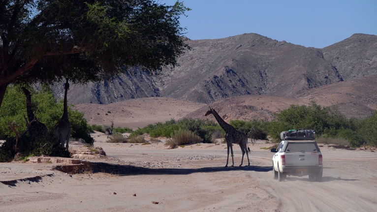 Giraffen und Oryxantilopen beäugen uns neugierig, beschäftigen sich aber kurze Zeit später mit dem Abknabbern von Blättern und Knospen. Das Tal bietet Wasser, saftiges Grün, ein Schlaraffenland gegenüber der trockenen Wüste der vorausgegangenen Tage. Erst im Hoanibtal werden wir hinsichtlich Wüstenelefanten fündig.