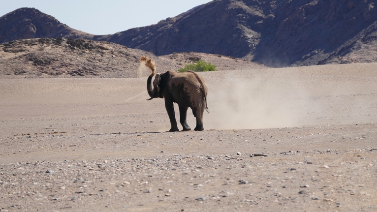 Vor uns befindet sich eine Herde von 17 Wüstenelefanten. Ein großer Elefantenbulle wirbelt mit dem Rüssel um sich und bläst Sand zum Schutz vor der Sonne über seinen massigen Körper.